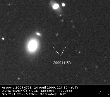24 апреля 2009г. в результате патрульной съемки площадок в созвездии Девы, был открыт ранее неизвестный астероид. На карте автоматических обзоров, как раз в той области где я его нашел, остался просвет в несколько квадратных градусов, поиск проводился в западной части просвета, где и была вероятность "зацепить" пропущенный астероид. К счастью погода в это время стояла благоприятная, на следующую ночь я без проблем нашел этот астероид по рассчитанным самостоятельно эфемеридам, и днем 26-го апреля я уже получил уведомление, что этот астероид открыт именно мной и ему присвоено предварительное обозначение 2009 HJ58.