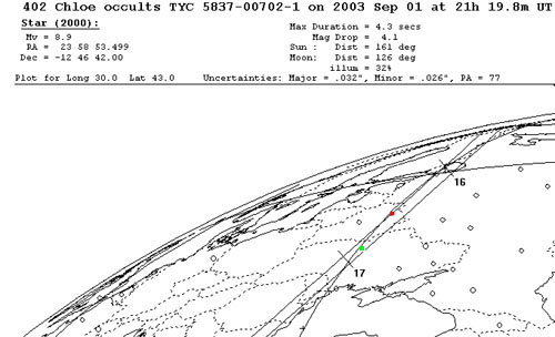 Действительная полоса покрытия сместилась примерно на 50км к западу от предсказанной. Ширина полосы была порядка 100км, звезда находилась на высоте 18 градусов над горизонтом. Пункт наблюдения Сергея располагался на касательной к предполагаемой полосе (см. рисунок, он отмечен красной точкой). В действительности оказалось, что он попал практически в самый центр полосы, так как зарегистрированная длительность покрытия составила 4.17сек (расчетная максимальная длительность - 4.3сек, при условии диаметра астероида Chloe - 54км). Не исключается и тот факт, что диаметр астероида больше предсказываемого.
