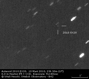 10 марта 2010г. в обсерватории на поисковой серии изображений на границе созвездий Девы и Льва был открыт новый астероид. Погода у нас в это время установилась отличная, и на следующий день я смог получить подтверждающие изображения этого астероида.