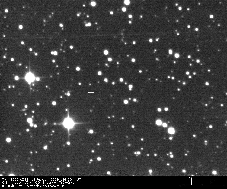 18 февраля 2009г. была предпринята попытка получить изображение транс-нептунового объекта (ТНО). Это самые далекие тела нашей Солнечной системы и поэтому очень слабые, но их реальные размеры порядка сотен километров в диаметре. Для моего телескопа наблюдение подобных объектов не простая задача, в качестве цели был выбран астероид 2003 AZ84, блеск которого на момент съемки был 20.5m. Необходимым условием успеха здесь является хорошая спокойная атмосфера. В начале сессии было очень хорошее изображение, но после первых трех кадров оно стало размываться, и в итоге я смог выбрать только 7 сносных кадров, хотя планировал получить примерно 2-х часовую серию. Но мне все же удалось достигнуть положительного результата.